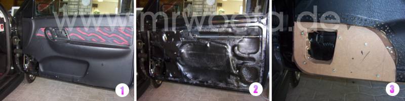 2. Die Türen müssen selbstverständlich stabil gedämmt werden, dazu hat der Besitzer schon 3-4 Schichten 2,6mm Bitumenmatten aufs Außenblech und nochmals ähnlich viele aufs Innenblech geklebt, und vor allem die ganzen Löcher im Innenblech verschlossen, damit die Lautsprecher später in der Tür ein möglichst geschlossenes Volumen vorfinden. |