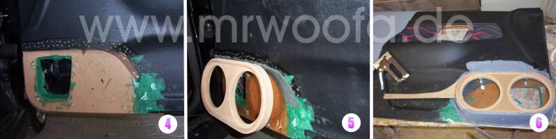 3. Dann wird (am besten macht man sich vorher eine Schablone) eine Grundplatte ausgesägt und am Türblech befestigt. dazu haben wir an 6 später durch die Lautsprecheröffnungen zugänglichen Punkten 6mm Löcher gebohrt, wo Inbusschrauben mit großer Unterlegscheibe und Muttern in der Tür der Sache den nötigen Halt geben. |