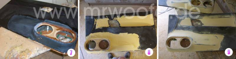 7. Dann wird auch das eingeharzt. Immer schön drauf achten, das das Harz das Formvlies komplett durchtränkt. Das eingestezte Stoffteil kann man hier nicht ohne weiteres entfernen, also haben wir es ebenfalls eingeharzt und später verspachtelt. |