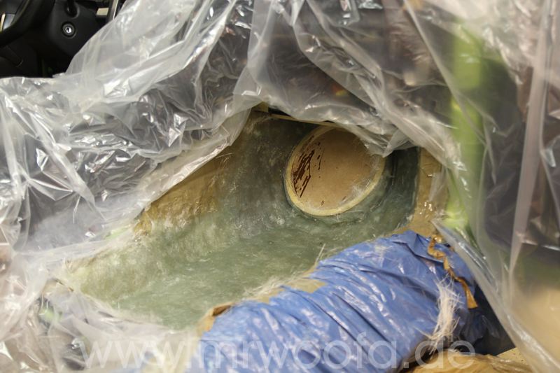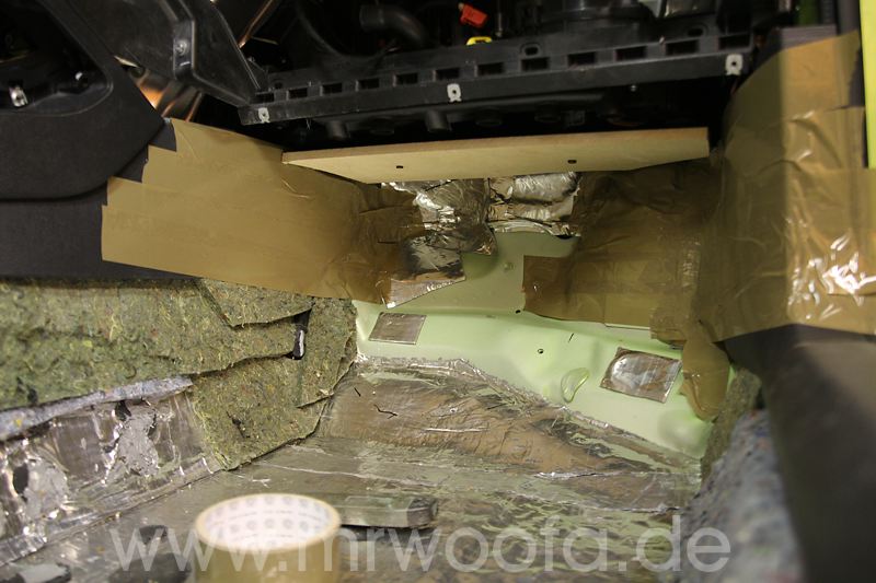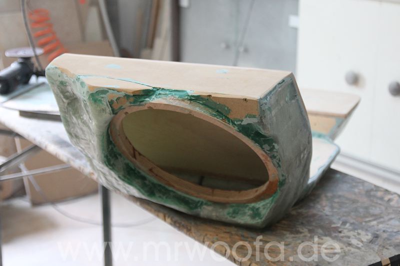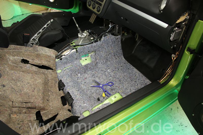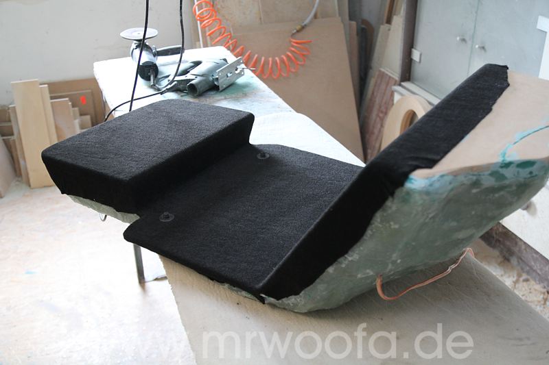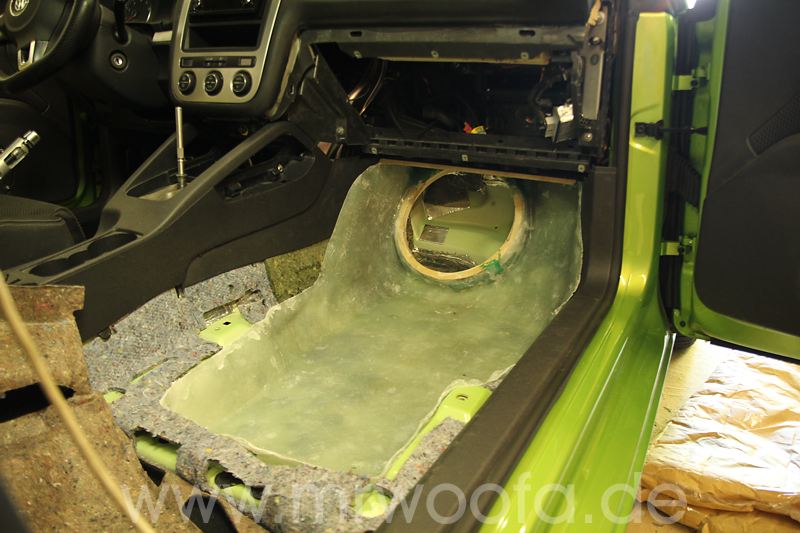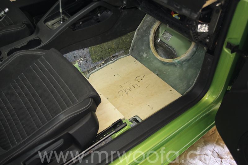 Selbst beim besten Frontsystem bleibt immer noch das Manko, das der Sub im Heck, so gut er auch angekoppelt ist, in den allerseltensten Fällen wirklich vorne spielt, sondern eher im Fahrzeug. Um dieses Problem loszuwerden, muß der Sub nach vorne. Vorschläge mit einem 8" oder 10" Chassis gibt es viele, ich will aber die hinteren Subs ganz ersetzen und abue einen 12" ein. Das das Ganze etwas auf Kosten der Beinfreiheit des Beifahrers geht, ist klar, effektiv gehen etwa 10-12cm verloren. Diese Art der Verbauung ist nicht auf meinem Mist gewachsen, Dirk Wölfinger hat dies schon seit einigen Jahren erfolgreich in seinem Audi A4, allerdings mit einem 10" ODR Subwoofer.