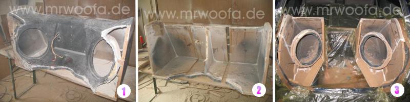 5. Zoom Dann wird alles gut eingeharzt, das es bis innen durchtränkt ist. Bei der Montageplatte für die Rockford bin ich auch schon angefangen,sie wird auf 2 in den Kisten befestigten M10 Schrauben eingehängt, und oben per SPAX an Winkeln befestigt. |