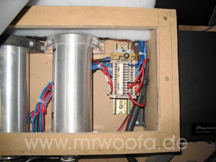 So siehts unter der Abdeckung aus, die Steg K4.02 ist erst am 19.4.07 eingezogen und versorgt die Tieftöner am Frontsystem, MT und HT befeuert die BRAX aktiv.
