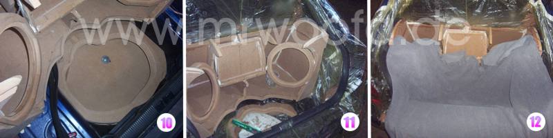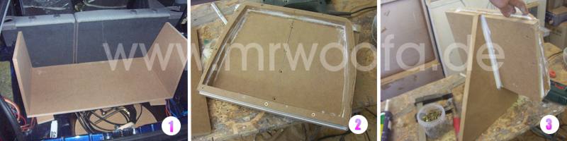 1. Zuerst einmal fängt es wie jeder Kofferraumausbau an. Zwei MDF-Streifen werden auf den Kofferraumboden geklebt, mit Karosseriekleber oder entsprechendem Montagekleber, dann die Bodenplatte und die äußeren Seiten zusammengeklebt, wer wenig Zeit hat nutzt Schrauben als Schraubzwingen-Ersatz, aber bei MDF immer mit 2,5 mm vorbohren bei 4mm SPAX sonst reißt es auf. |