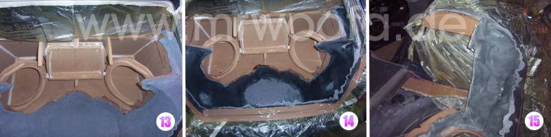 14. Zoom Dann wird das Vlies mit Polyesterharz getränkt, und zwar bis es komplett durch ist. Falls dem nicht so ist und die Rückseite nach dem aushärten noch lauschigist, nochmals von dortordentlich Harz auftragen. Bei der hier gezeigten Ecke gingen etwa 3l Harz rein. |
