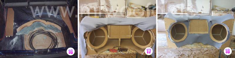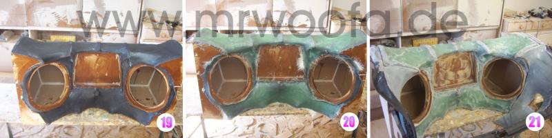 20. Zoom Da das Formvlies für eine Subwooferkiste alleine zu dünn ist, werden noch etwa 6-8 Lagen 450gr Glasfasermatten auflaminiert, besonders auf größeren geraden Flächen ist das nötig. Nochmal ca. 2,5l Harz. |