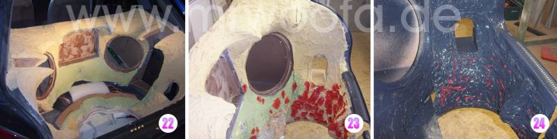 11. Zoom Jetzt wird der gesamte Kofferraum mit Plastikfolie abgeklebt, ich verwende gern Gelbe Säcke, die sind recht groß und umsonst :-) Auch den Freiraum zwischen Rücksitzlehne und Dachimmel sowie das Blech außen abkleben, Harzspritzer bekommt man nicht wieder runter. Für die Übergänge zu den Konturen des Fahrzeugs habe ich die originalen Kofferraumverkleidungen vom Schrott besorgt und bis auf einen schmalen Rand weggesägt. |