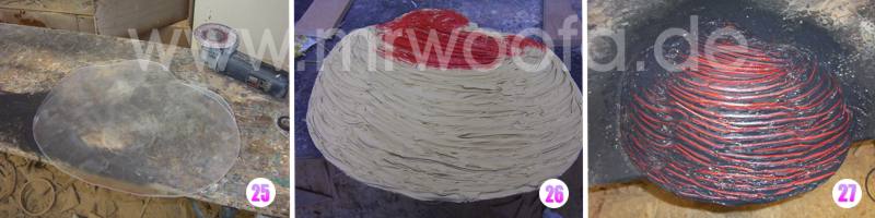 26. Mit Polyesterfüllspachtel wird nun eine Schicht aufgespachtelt, und mittels dünnem Holzstück die gewünschte Struktur hergestellt, dabei natürlich möglichst bis zum Plexiglas freikratzen,damit es später leuchten kann. Dann werden die Vertiefungen wieder mit rotem Lack angemalt... |
