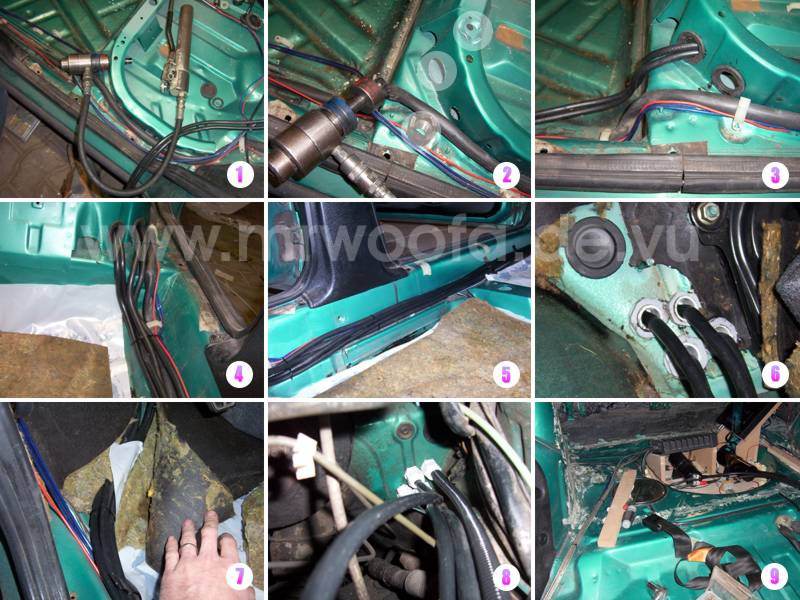 1. Das erste Hindernis, was besonders bei sehr dicken Kabeln wie den meinen Auftritt, sind enge Stellen. Der originale Kabelbaum geht neben dem Sockel für die Rücksitzbank entlang, die Stromkabel bekomme ich aber nicht mehr mit unter den Teppich. Also muß unter der Rücksitzbank eine Durchführung ins Blech geknackt werden. Es muß ja nicht gleich solch eine feine Hydraulikpumpe sein, die Teile gibts auch zum Schrauben. Zuerst bohrt man ein 10,5mm-Loch, dadurch kann man dann den Pinn der Pumpe stecken, auf welche man das Gegenstück für den gewünschten Durchmesser gesteckt hat, die Schneide schraubt man dann von der anderen Seite auf dem Pinn und dann wird gepumpt, der Pinn zieht die Schneide durchs Blech...