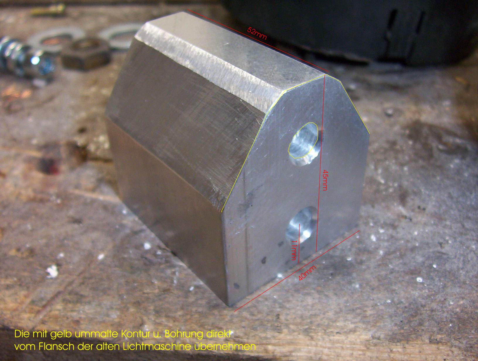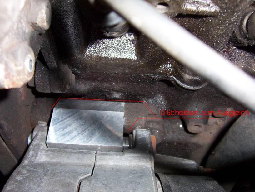 24. Da die Golf3-LiMa als Halter genau das Ding hat, was bei mir am Auto ist, brauchs da nen kleinen Adapter. Den habe ich aus nem Alu-Klotz selber gebastelt. War bei mir verdammt eng, ich würde jetzt die Löcher noch 3mm mehr als nötig auseinander machen. Vorher unbdingt den Abstand von der Riemenscheibe zum Halter messen, daß der Riemen hinterher nicht schräg läuft. Ich habe den Halter etwas schmaler gemacht als der Zwischenraum und ihn mit Unterleg- oder besser, paßscheiben um die entsprechenden mm 'verschoben', das ganze dann am Motor-Halter nochmals, dann in die andere Richung. Bild mit Maßen Bild Unterlegscheiben