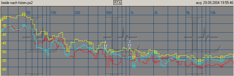 Weitere Planung: Sportsitze vorne mit passender Rückbank in dunkelblau, evtl. neuer (Velours-)Teppich. Weitere Verfeinerung der Anlage durch stetiges Hören, Messen und Abstimmen der Weiche. Eine Messung möchte ich euch natürlich auch nicht vorenthalten: