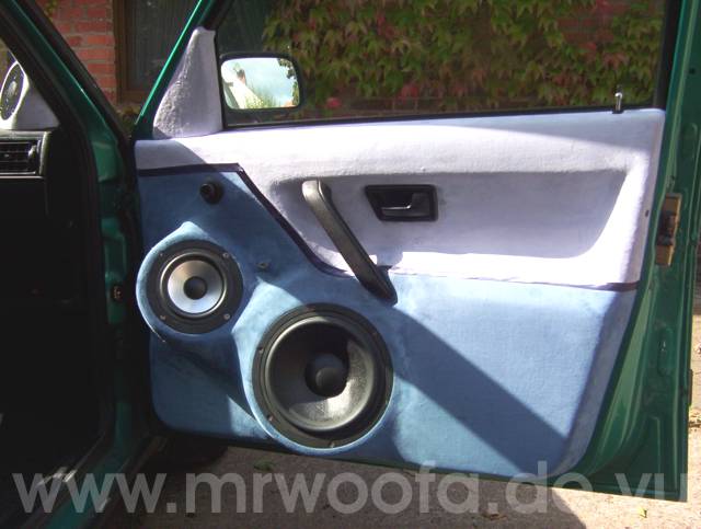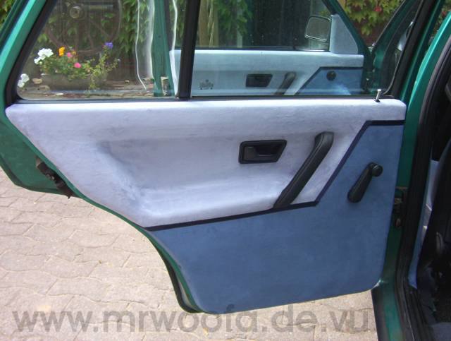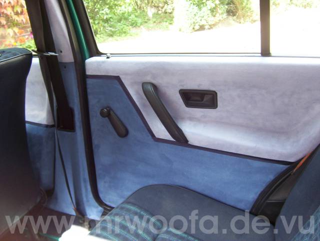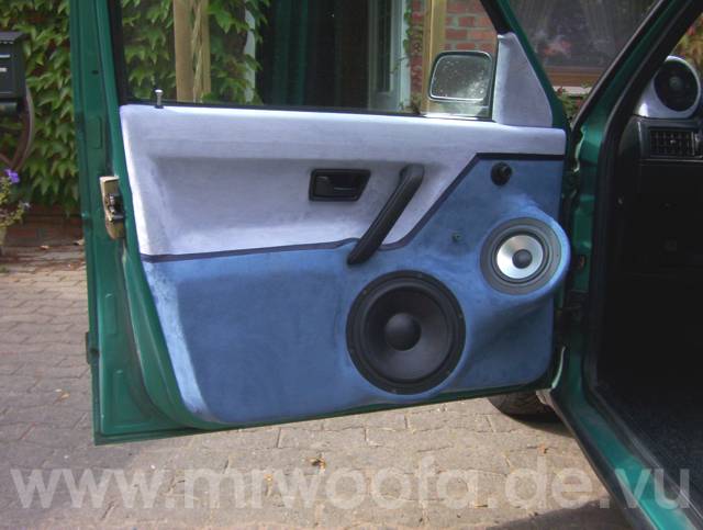 Bei offener Tür sieht man die Doorboards am besten. Sie sind komplett dicht, es besteht keine Verbindung zur Tür. Als Bass arbeitet ein Visaton GF 200 ab etwa 70Hz über die Endstufe getrennt in einem 12l großen, komplett geschlossene Gehäuse, und übergibt bei ca. 450Hz an den Mitteltöner Visaton AL 130 M in etwa 1,5l. Die Boards sind mit zum Kofferaumausbau passenden hellblauem Alcantara bezogen. Die Türkurbeln passen nicht mehr, da sollen bei Zeiten mal runde Knöppe drauf zum drehen.