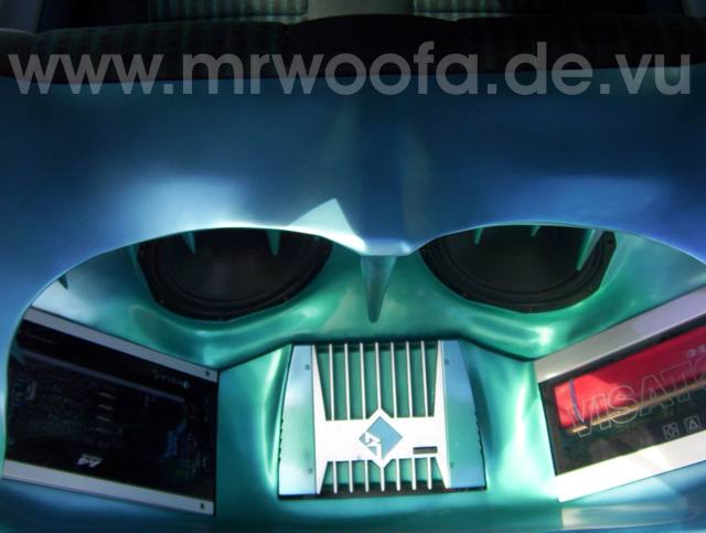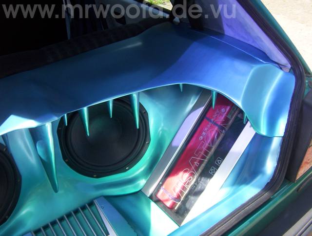 Der Kofferaum wurde komplett mit GFK ausgebaut. Die beiden Subs VISATON TIW 360 X arbeiten je auf ein 40l großes, geschlossenes Gehäuse. In der Mitte ist die für den Sub zuständige Rockford-Fosgate punch 500a².