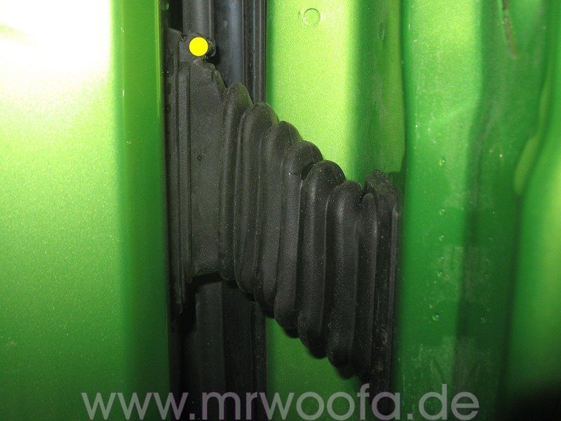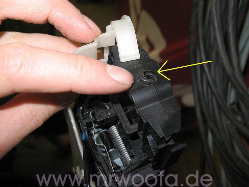 Um jetzt den AGT auszubauen, muß das Schloss gelöst werden, da es mit einem Kunststoffbügel am AGT befestigt ist. Dazu zuerst den Türgriff abbauen. Im Bild gelb markiert ist ein Aufkleber, den abziehen, darunter sieht man einen Plastikclips, hier mit einem umgebogenen Draht hinterhaken und ihn ein Stück herausziehen.