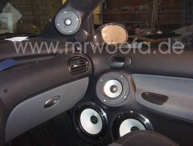 Die Visaton AL 130 M als Mitteltöner haben eine ca. 1,5l großes, stark bedämpftes geschlossenes Volumen und sind natürlich auf den Fahrer angewinkelt. Die Hochtöner Visaton KE 25 SC wurden an die A-Säulen integriert, soweit dies die 104,5mm Einbaudurchmesser zulassen, sieht aber sehr stylisch aus und ist nicht im Sichtfeld.