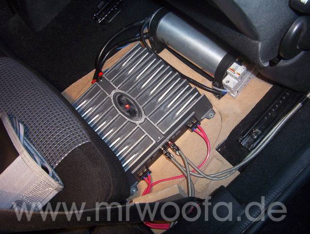 Da ja wie schon geschrieben der Kofferraum völlig frei bleiben sollte, haben wir die Endstufen im Fußraum untergebracht. Die sehr flache Helix findet nun vor dem Beifahrersitzt ihren Platz, und beeinträchtigt die Fußfreiheit trotz hier gerade voll zurückgefahrernen Sitzes in keinster Weise. Kommt natürlich noch eine mit passendem Stoff bezogene Abdeckung drauf, nach hinten bleibt es offen für die Kühlung.