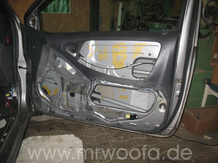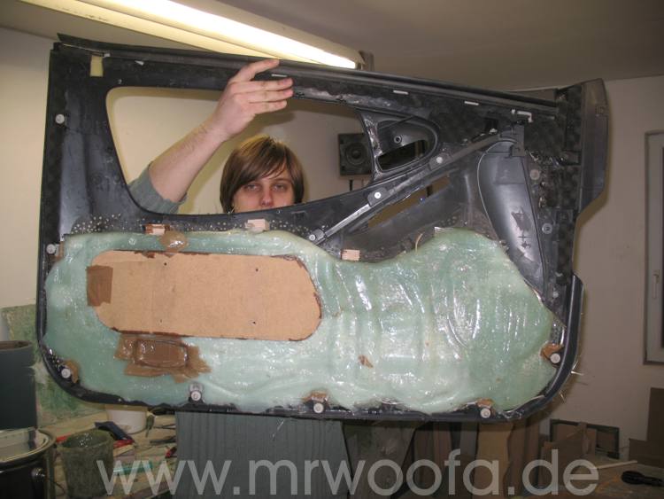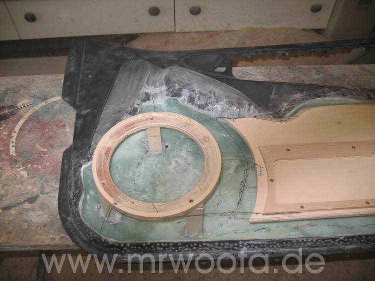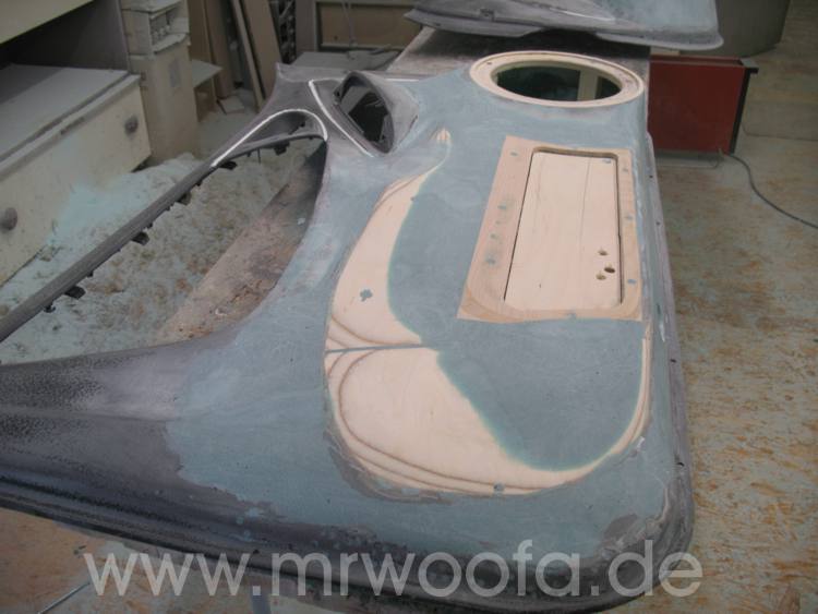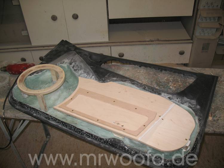 Am Anfang mußten erstmal die alten Dooboards zerlegt werden, dies habe ich praktischerweise auf einem Weg mit der Stichsäge erledigt :) Das Stoffteil ist von hinten verschweißt, dies kann man jedoch prima mit Bohramschine + Senker aufbohren, hinterher wirds dann verschraubt. Die Ränder der Verkleidung sind mit hunderten 5mm Löcher versehen, damit sich Harz und Spachtel gut daran halten, zuätzlich mit groben Papier angeschliffen. Wegen des zu erwarteten Mehrgewichts haben wir die alte Bitumendämmung komplett aus den Türen entfernt und durch am Blech verklebte Alustreben und 2 Lagen Alubutyl ersetzt (noch nicht im Bild) - da die LS nicht mehr auf die Tür spielen ist das mehr als genug. Gewichtsersparnis bei der Dämmung: 15kg Bitumen raus, 6kG Alubutyl rein --> 7kG gespart.