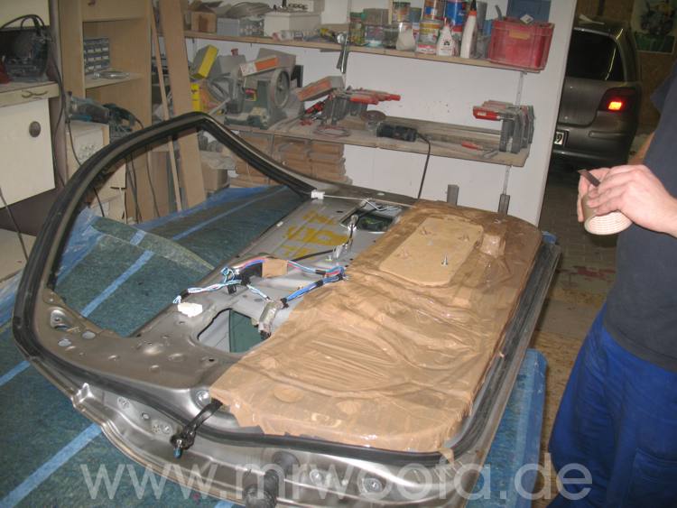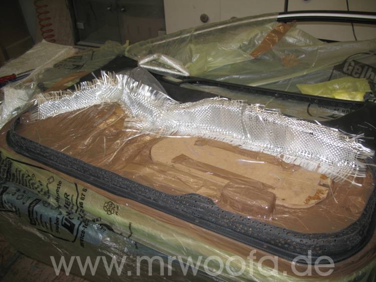 Nachdem die Tür komplett mit Spezial-Abdeckfolie gegen unerwünschte Harzspritzer geschützt ist, kommt die Verkleidung angeclipst + geschraubt, als Abschluß des Volumens nach oben habe ich schon ein paar Glasfasergewebematten mit Heißkleberpunkten fixiert.