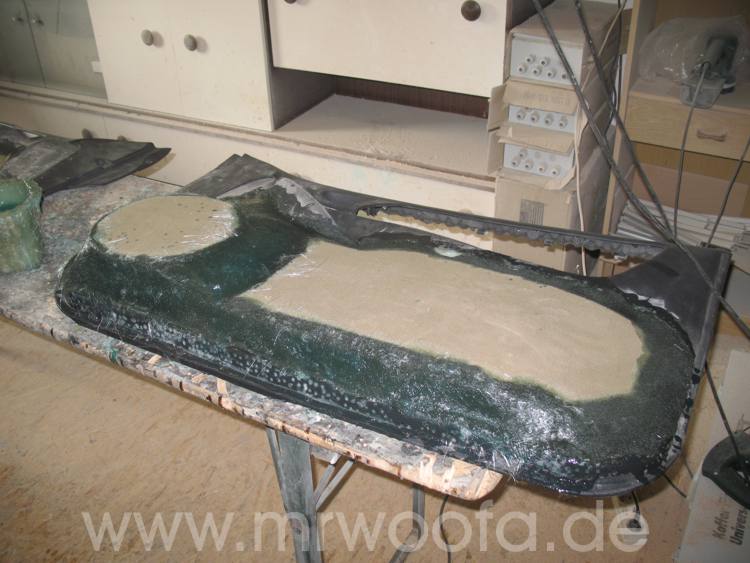 Einige Stunden und ca. 1,5kG Glasfaserspachtel pro Board weiter wars fertig. Die Verbindungskanten und die Falz um den Türgriff wurden zum einfacheren Beziehen zugespachtelt.