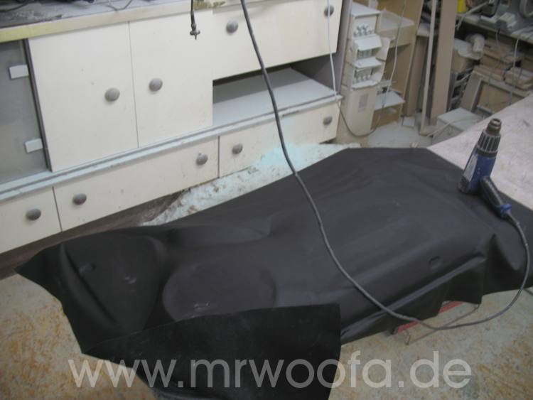 Dann konnte endlich mit dem bielastischen Kunstleder bezogen werden - mit 2 Leuten klappte das ganz gut - die gesamte Verkleidung ist Falten- und schnittfrei bezogen!