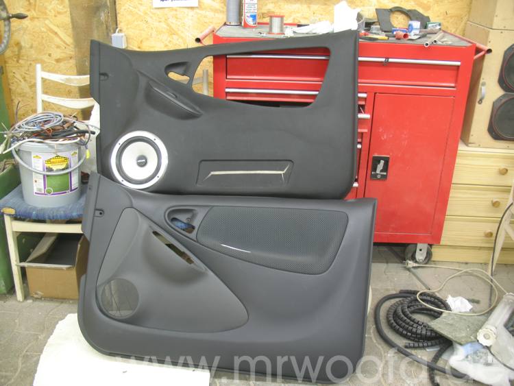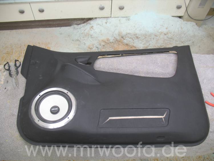 Um sowohl klanglichen Aspekten für die AYA UND meecrob's doch teils recht kranken Pegelansprüchen gerecht zu werden, haben wir uns entschlossen, die vorhandenen 16er die auf die Tür spielen durch 20er, genauer die bei mir schon erfolgreich verbauten Mivoc XAW 210 HC, zu ersetzen. Ziel: weniger Störgeräusche in der Tür, mehr Membranfläche und durch das in kleinen geschlossenen Volumina perfekt laufendes Chassis einen trockenen, klaren, präzisen Bass zu erreichen.