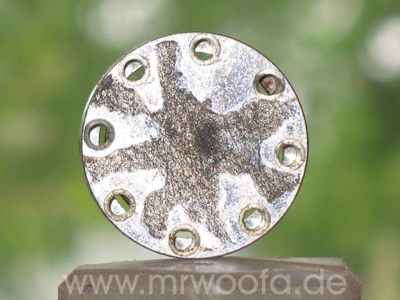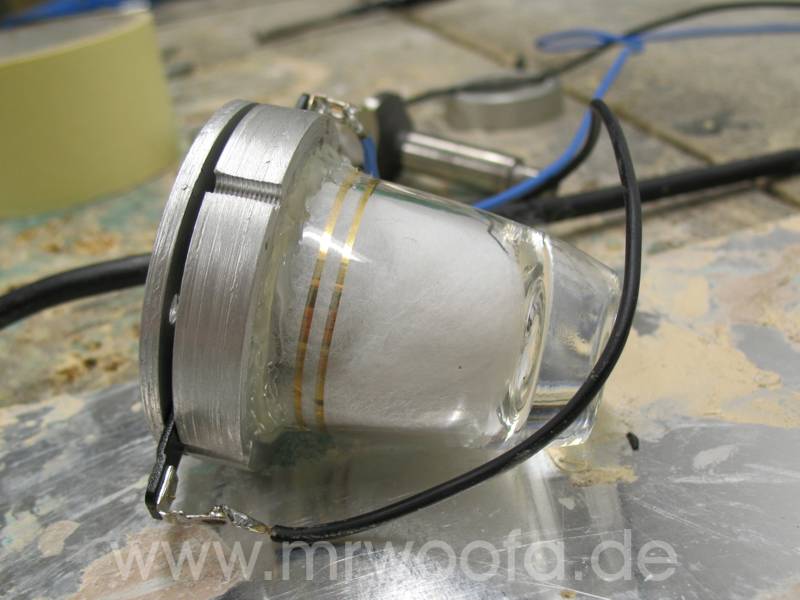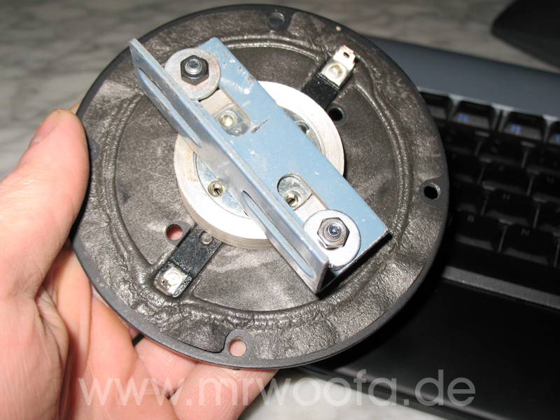 Vorerst endgültige Version, die Nasen des Diaphragmas sind abgeschnitten und die Zuleitungslitzen durch die halben Löcher am Rand herausgeführt. Der Aluring um den Magnetantrieb ist mit verklebt, die Front wird mittels 2 Schrauben am Aluring verschraubt, Zentrierung erfolgt nach Gefühl per Hand. Die anderen beiden Löcher dienen der Befestigung, entweder in einem Schallwandausschnitt im MDF oder wie hier