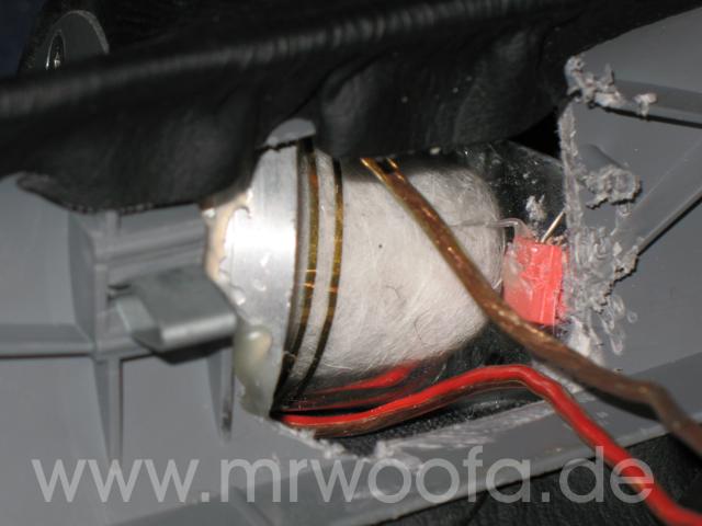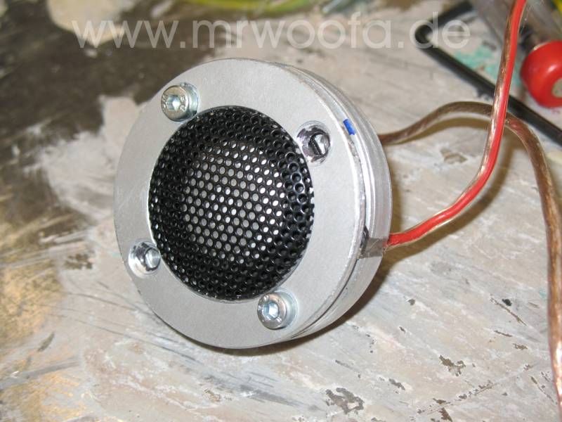 in eigens gedrehten Aufnahmetöpfchen aus Alu, durch den Auschnitt wird das Volumen angekoppelt. Die Schrauben sind mittlerweile durch Niro-Senkschrauben ersetzt worden.