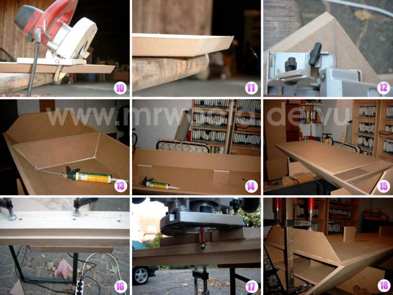 16. Um die Schrägschnitte für den Deckel perfekt zu bekommen, habe ich mir was mit der Oberfräse einfallen lassen. Zuerst mit der Handkreissäge grob nebenherschneiden, dann mit Zwingen ein !gerades! Brett auf die gewünschte Schnittlinie spannen...