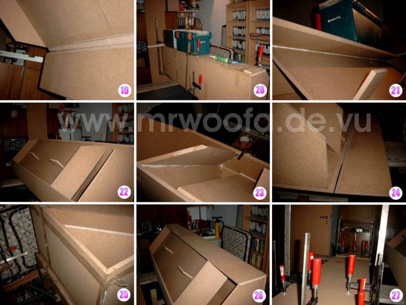 27. Da ich die Chassis gern versenken will, müssen hinter die Frontplatte an den Einbauorten der Chassis ca. 12mm dicke MDF-Platten geleimt werden. Die Körbe der TIWs sind 13 bzw. 14mm tief. Da würde bei 19mm MDF nicht mehr viel zum festschrauben stehenbleiben...