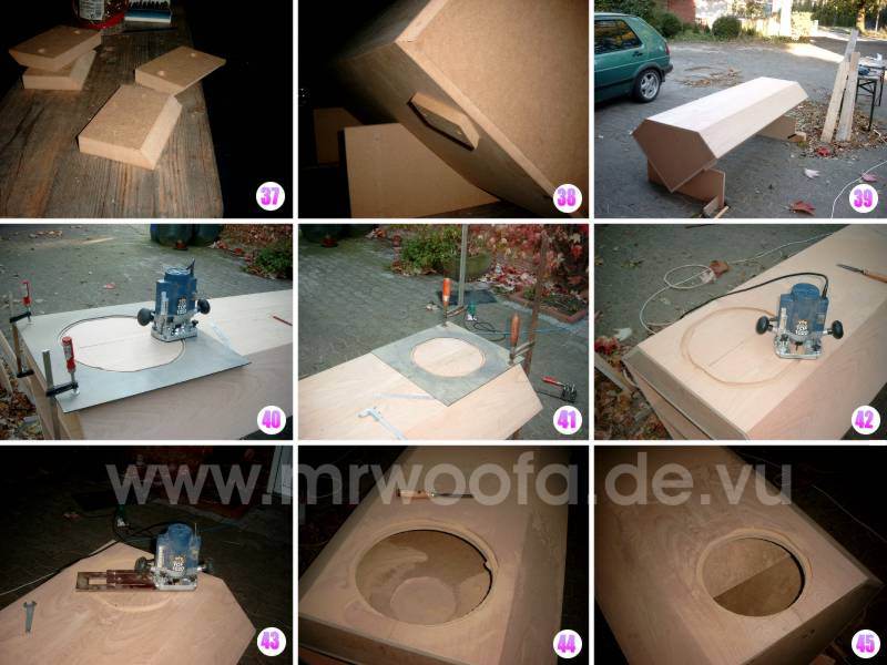 43. Jetzt die Ausschnitte für die Chassis mit dem Fräszirkel ausfräsen (oder notfalls mit der Stichsäge aussägen).